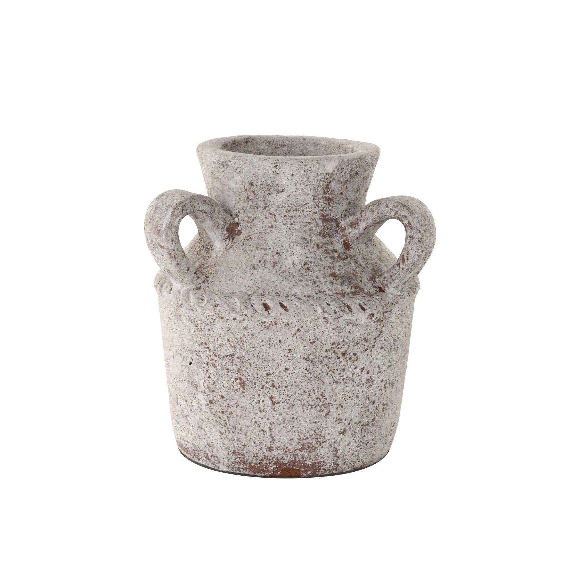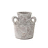 •Distressed vase for dried flowers takes on a classic round shape with three arched handles, and its surface is adorned with an abstract pattern of subtle cracks