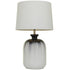 •The modern living room table lamp showcases craftsmanship with a glass body attached to a welded metal stem topped with a tapered polyester shade
