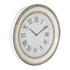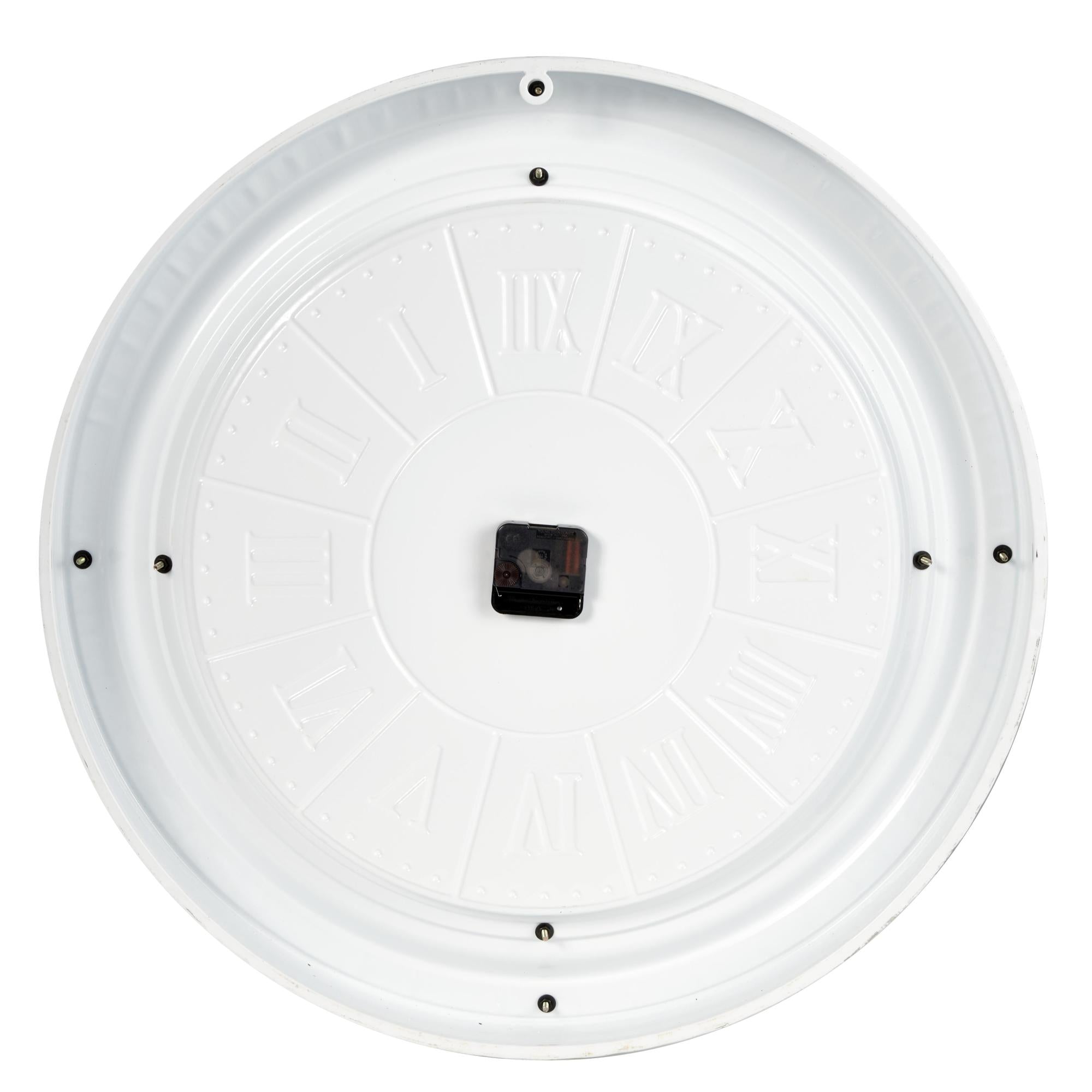 •The distressed oversized wall clock showcases a round double-border frame with small dots as minute markers, Roman numerals, and spade-shaped hands