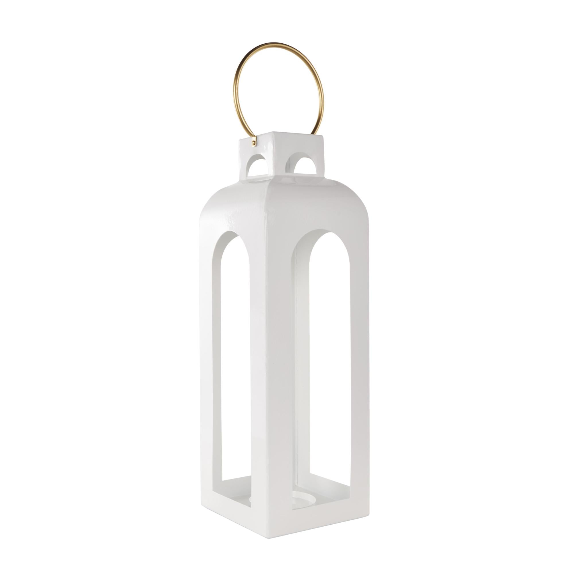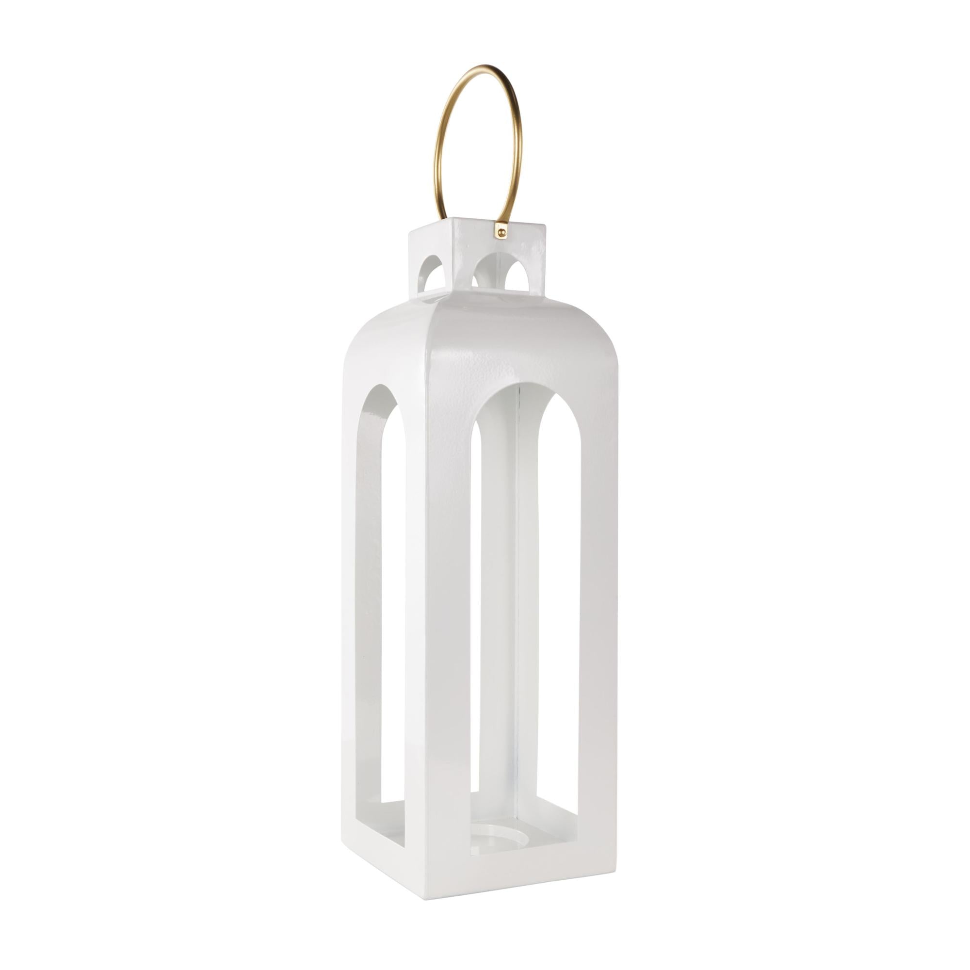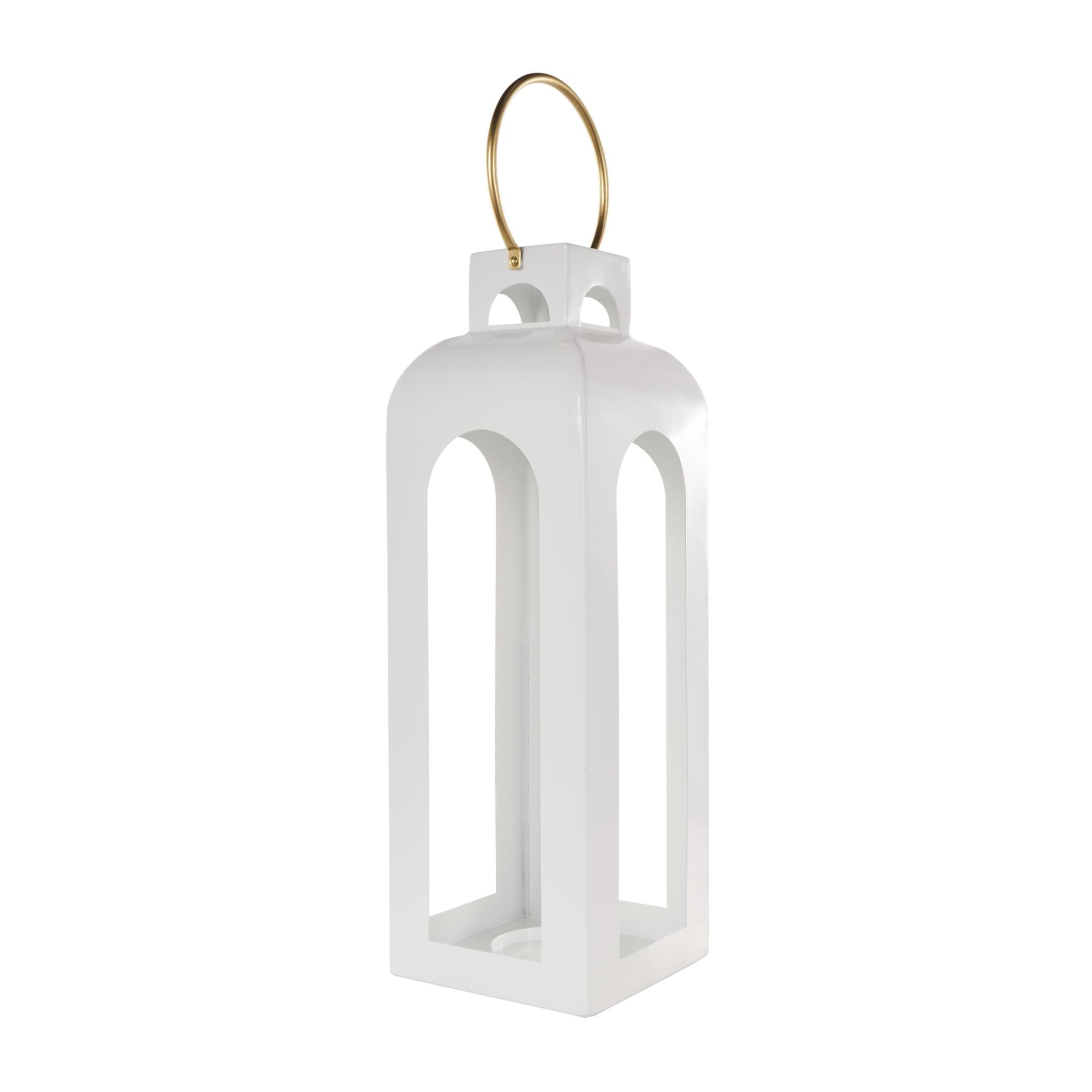 White Metal Tall Arched Cutout Indoor Outdoor Candle Lantern with Gold Handle