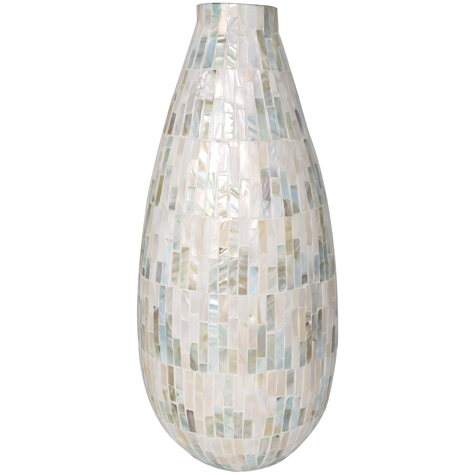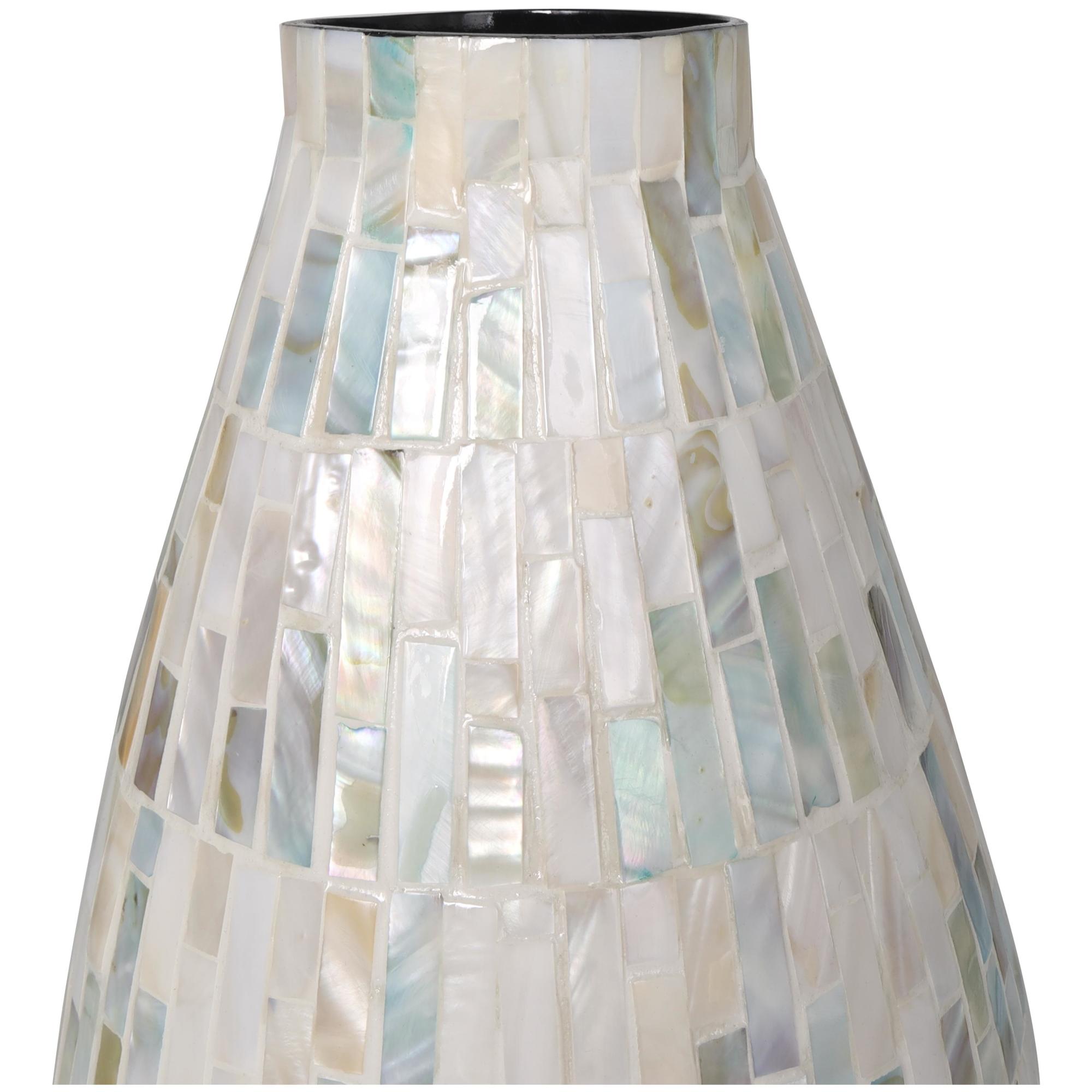 Show off this one-of-a-kind centerpiece vase as a decorative accent piece on a coffee table or console, or display your favorite flowers and greenery for a more captivating look. Designed with felt or rubber stoppers at the base that prevent scratching furniture and table tops, as well as sliding around. This item ships in 1 carton. Mother of pearl vase makes a great gift for any occasion. Due to the handmade nature of this item, no two will be alike, there will be slight differences in shape, size, and color. Suitable for indoor use only. This item ships fully assembled in one piece. Made in Vietnam. This is a single vase. Contemporary style. Vase has a 2.40 in mouth opening.