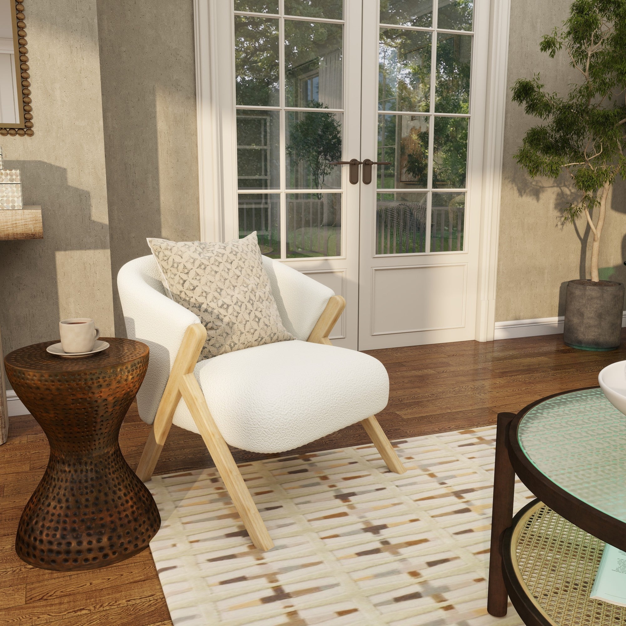 •This modern small space accent chair is constructed with a carved plywood frame with boucle upholstery, ensuring long-lasting durability