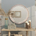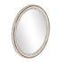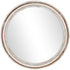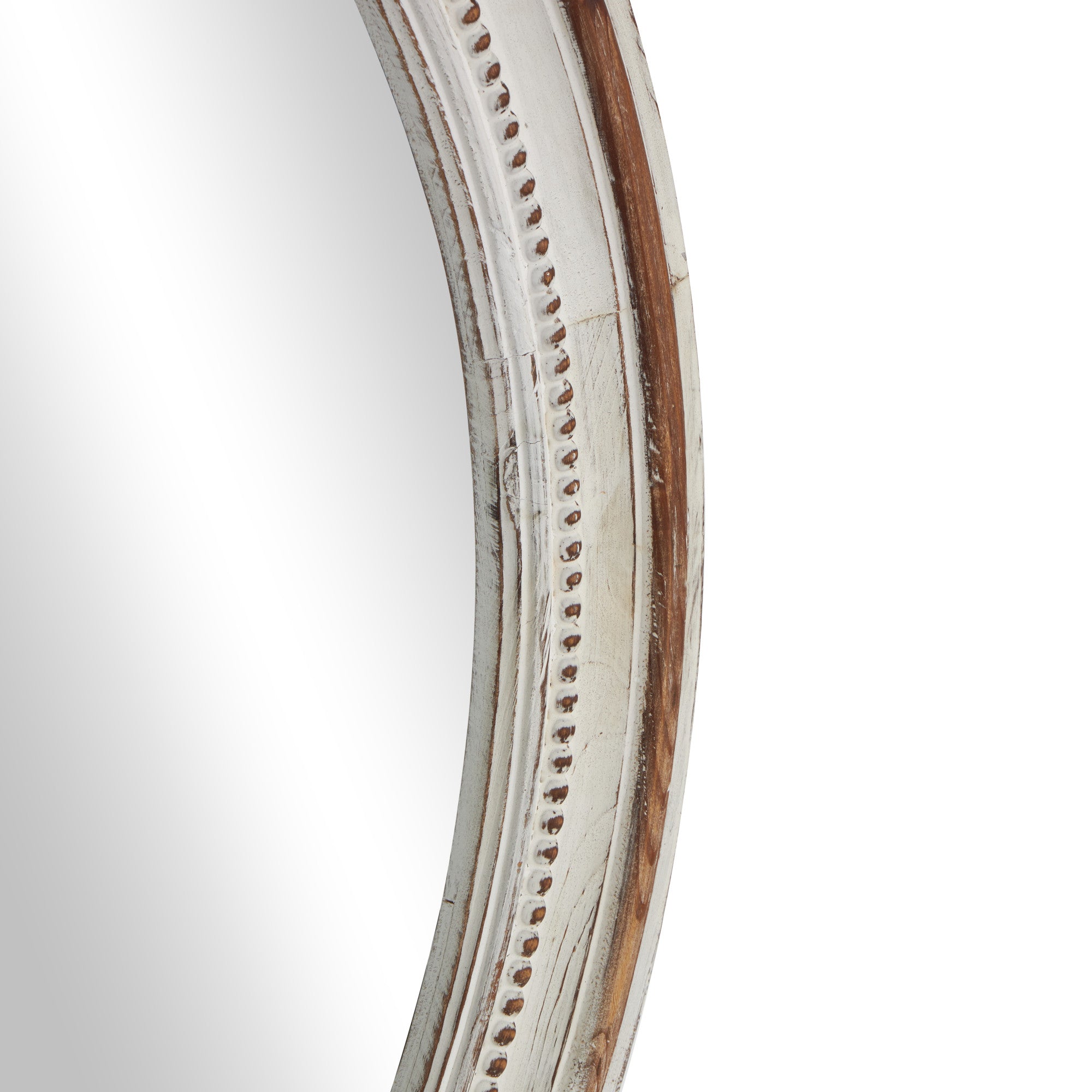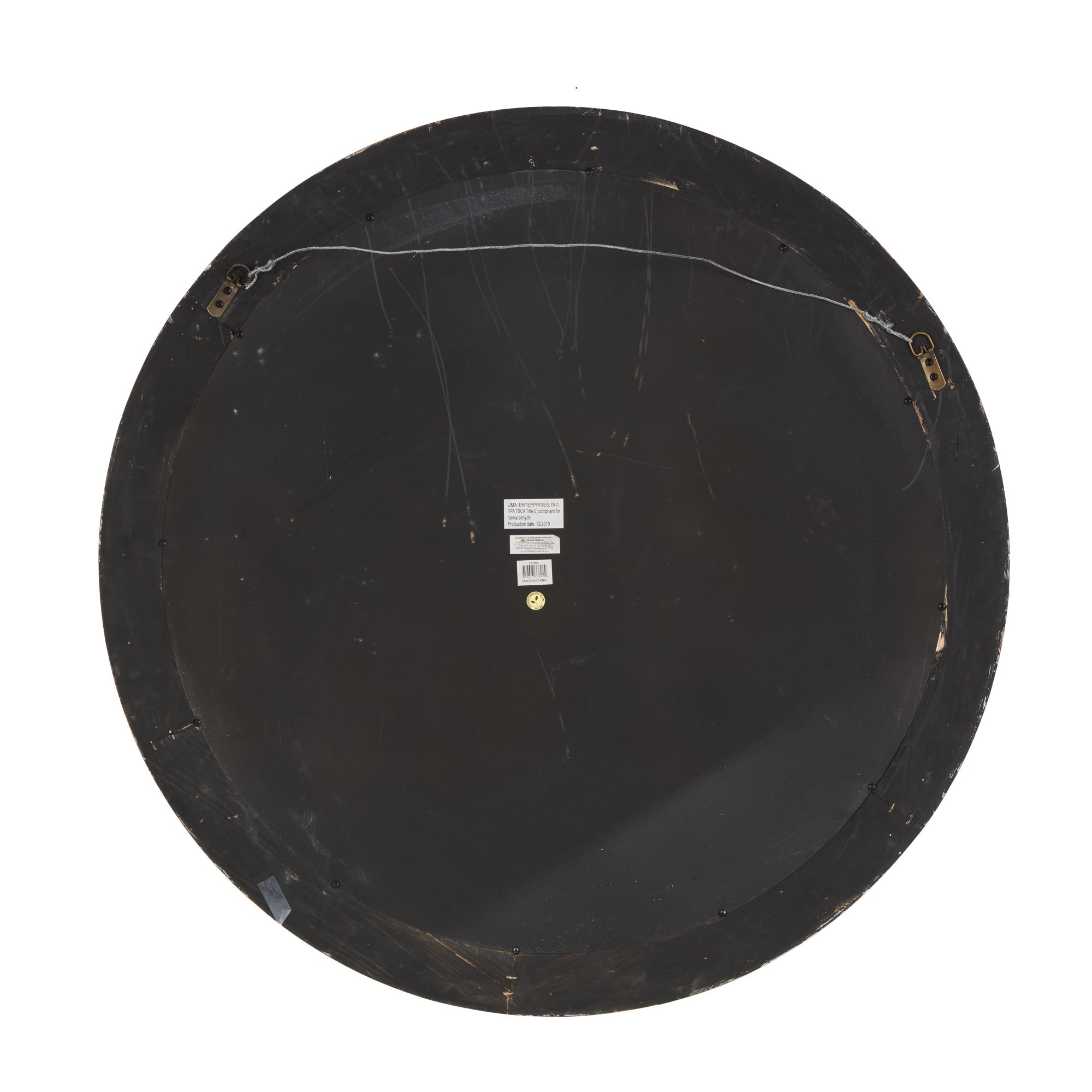 •The distressed mirror for wall showcases an oversized round design with a traditional wooden bead pattern
