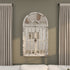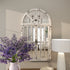 •Mimicking an oversized arched window shape with inner rectangular window panels, this distressed mirror for wall adds a touch of architectural elegance