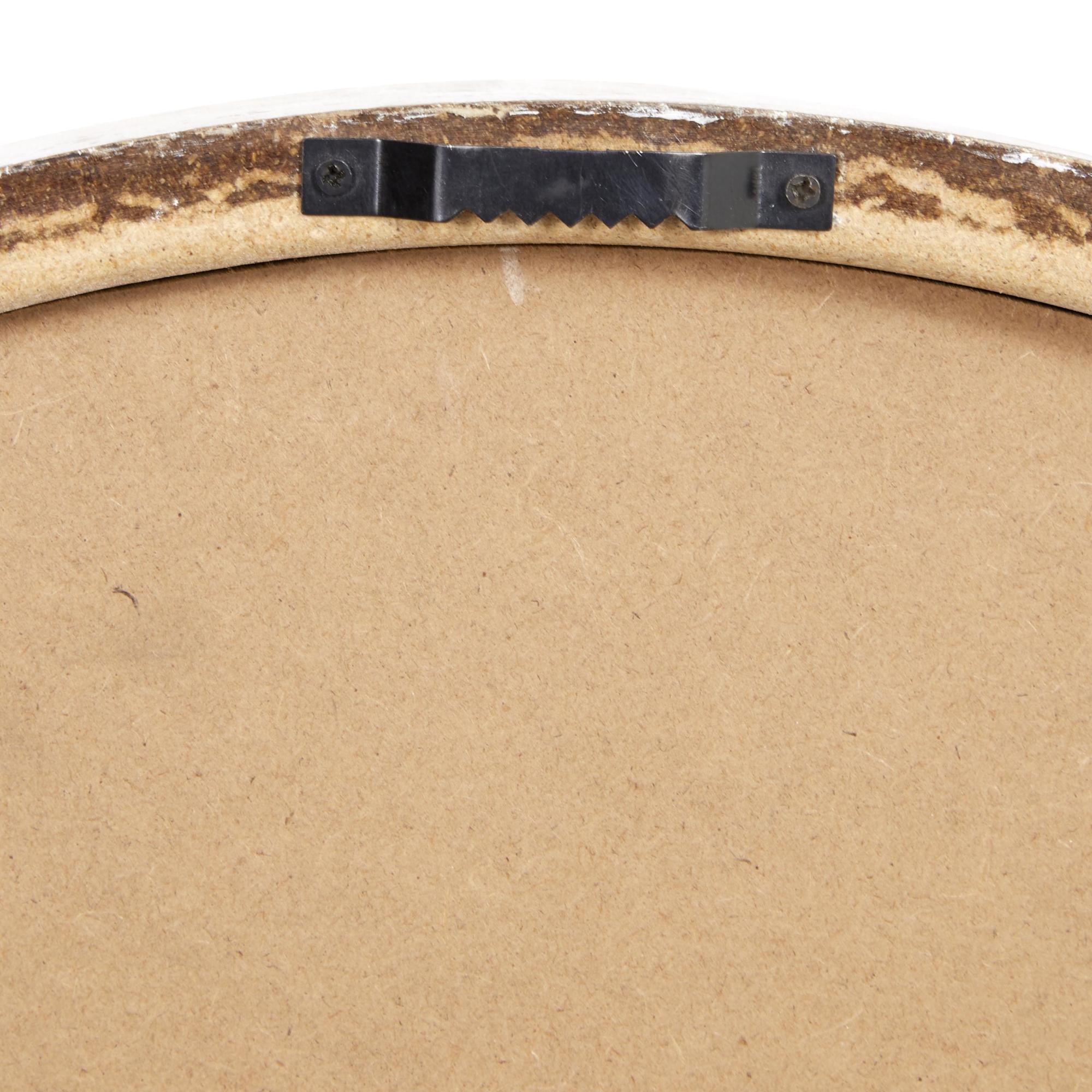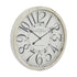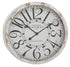 •Distressed oversized wall clock accentuates a round form with a meticulously painted clock face featuring spade-shape clock hands