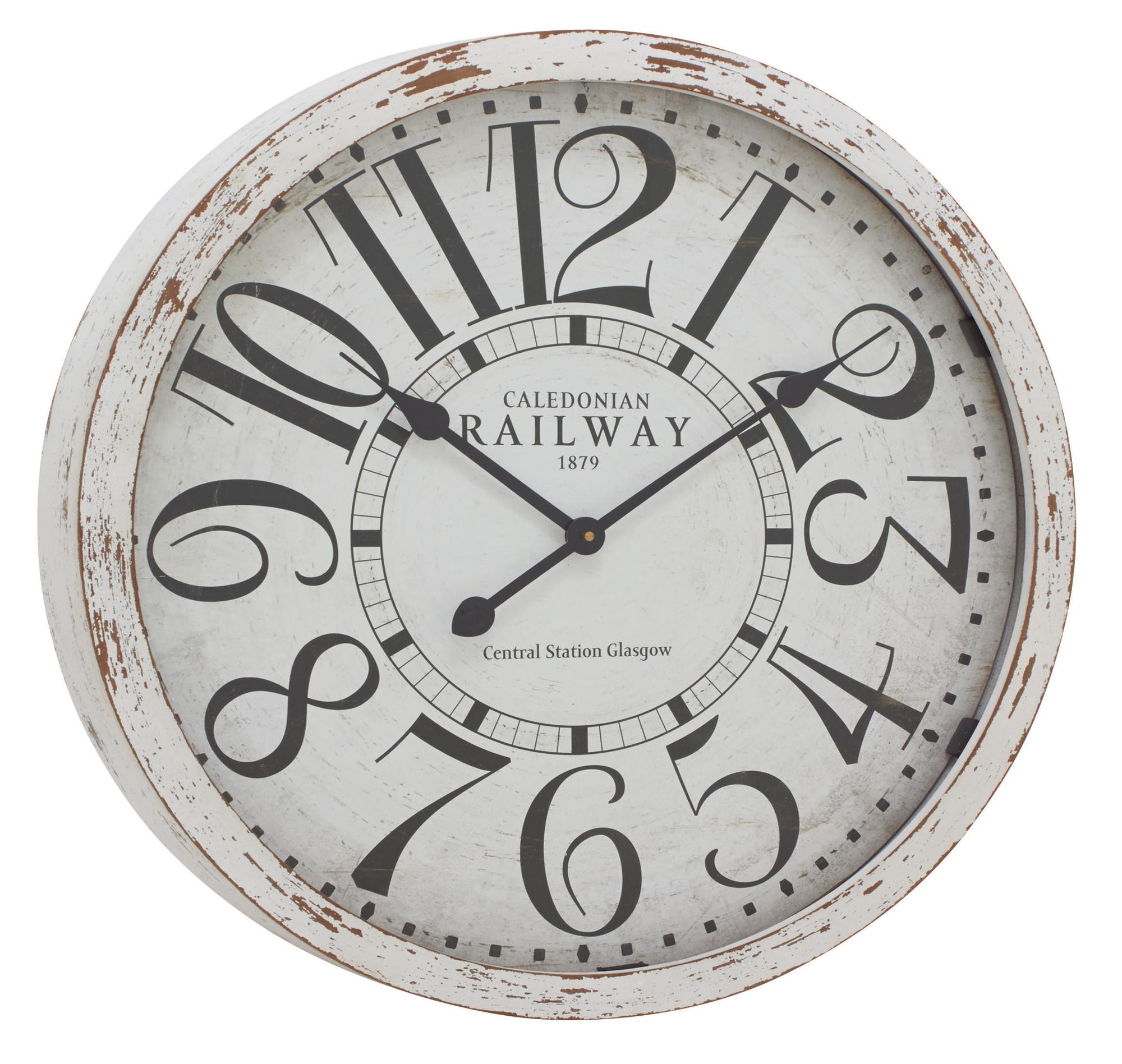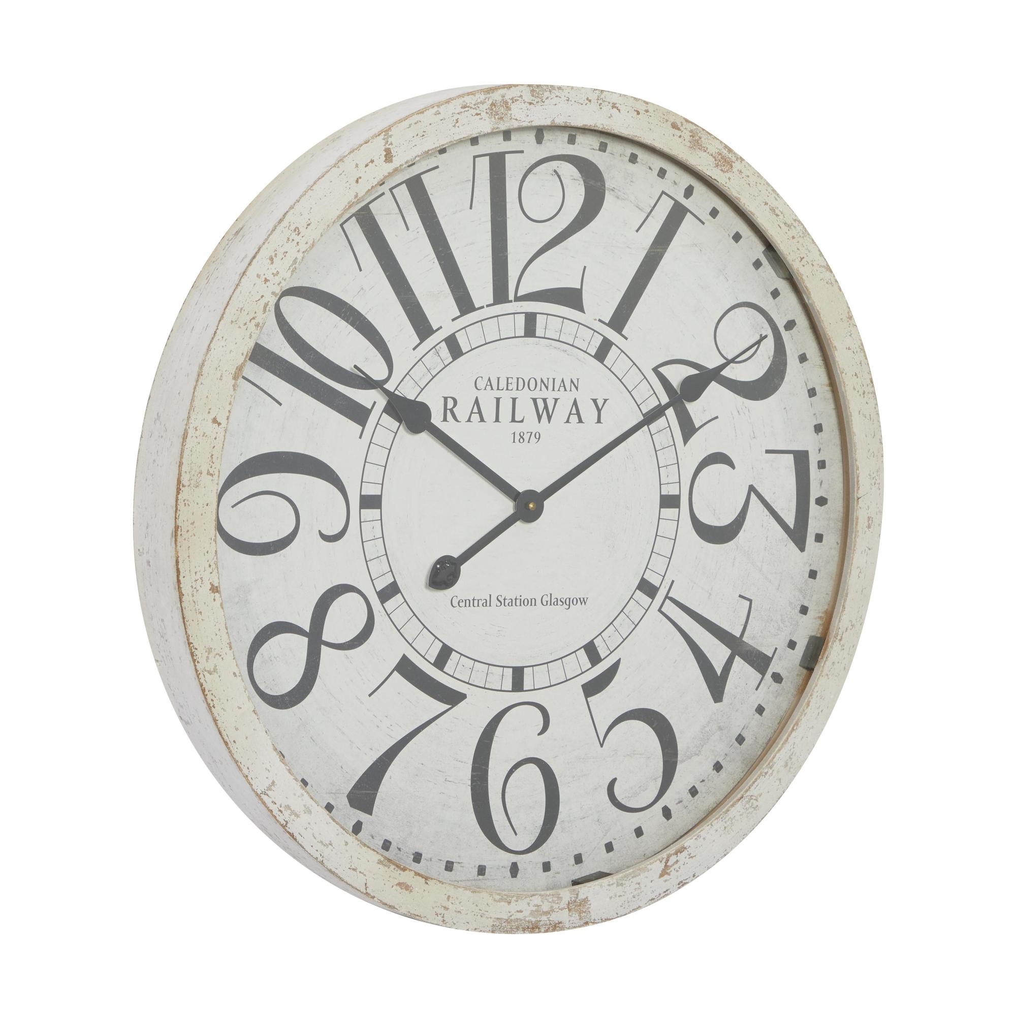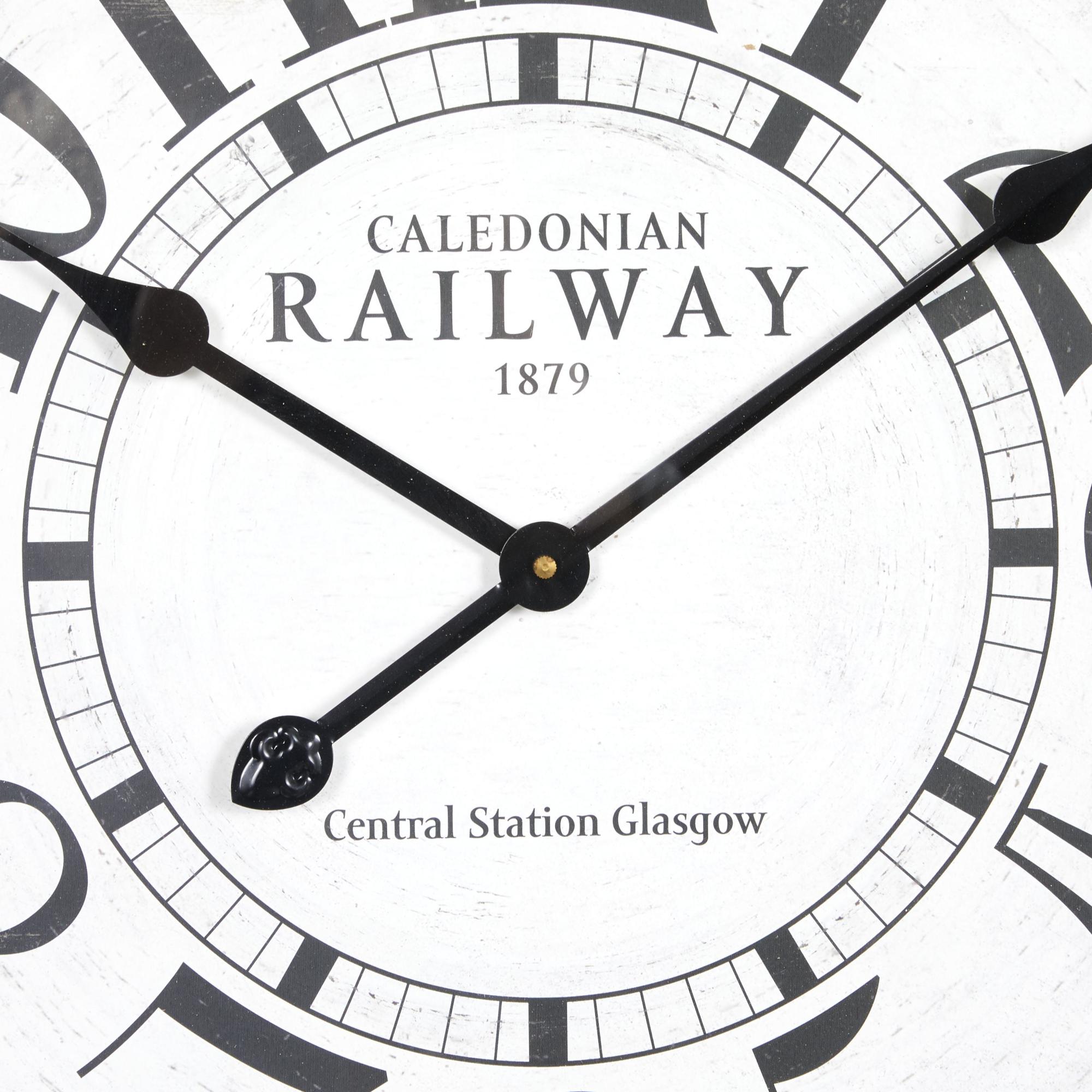 wall clock for home is a charming complement to your vanilla and pastel-painted walls in the living room, adding both style and functionality. Requires 1 AA battery, not included.. This item ships in 1 carton. Features Arabic numerals for the hour and minute markers. The clock mechanism runs silent. Can be hung vertically using the sawtooths; nails and screws not included. Suitable for indoor use only. This item ships fully assembled in one piece. Made in India. This is a single oversized wall clock. Vintage style. Showcases typographies of "Caledonian Railway 1879" and "Central Station Glasgow".