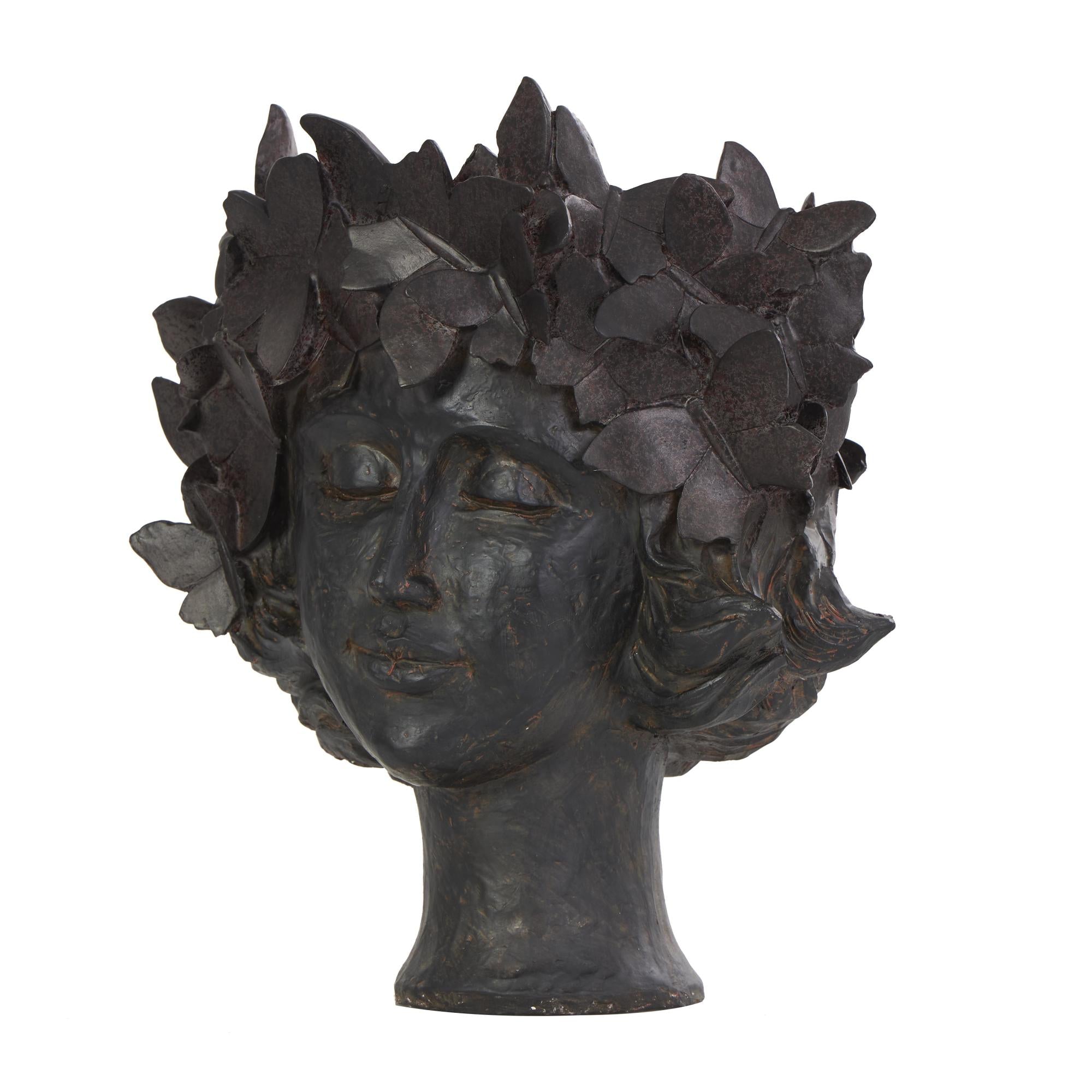Woman Bronze Resin Head Indoor Outdoor Planter with Wide Opening and Butterfly Accents