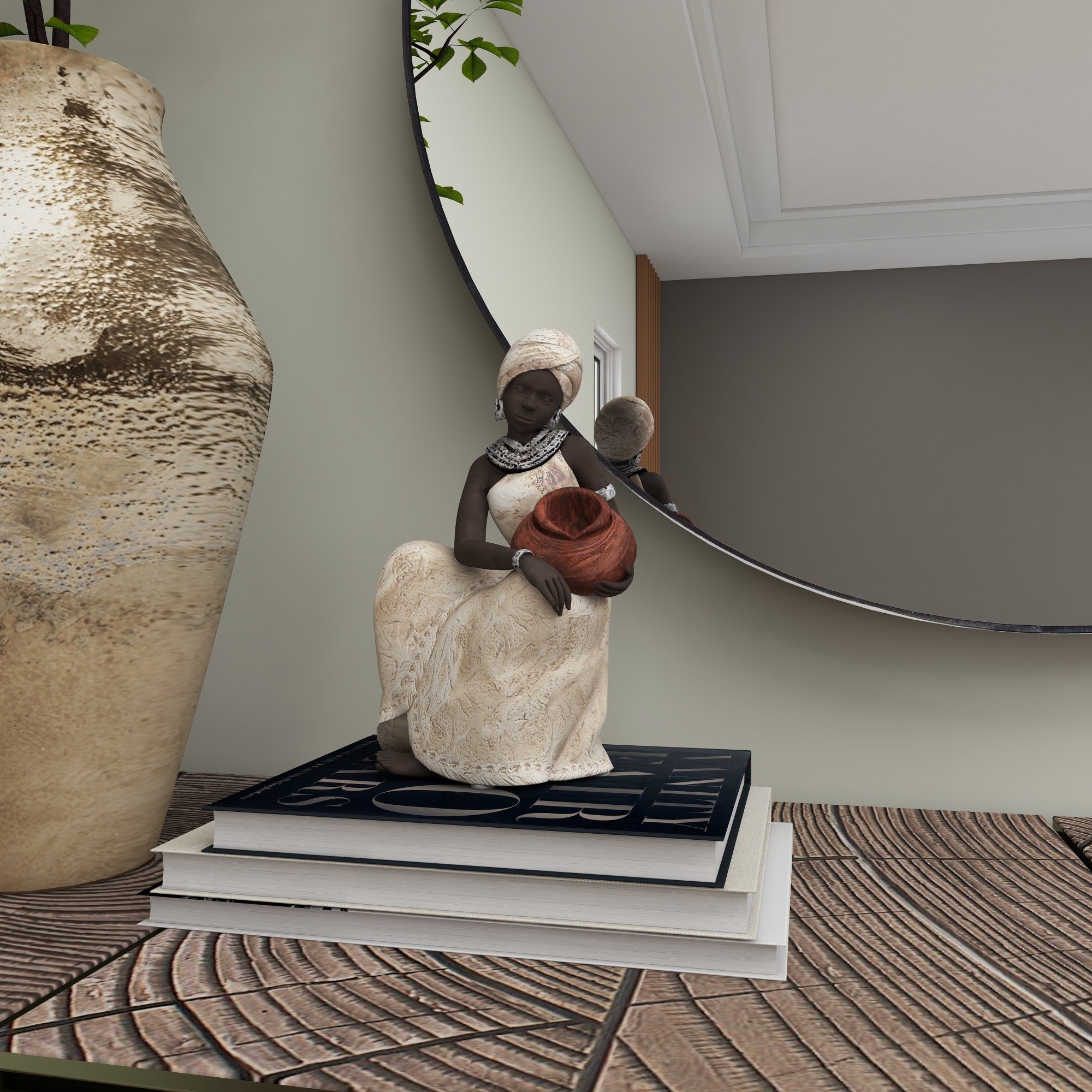Woman Cream Polystone Sitting African Decorative Sculpture with Red Water Pot