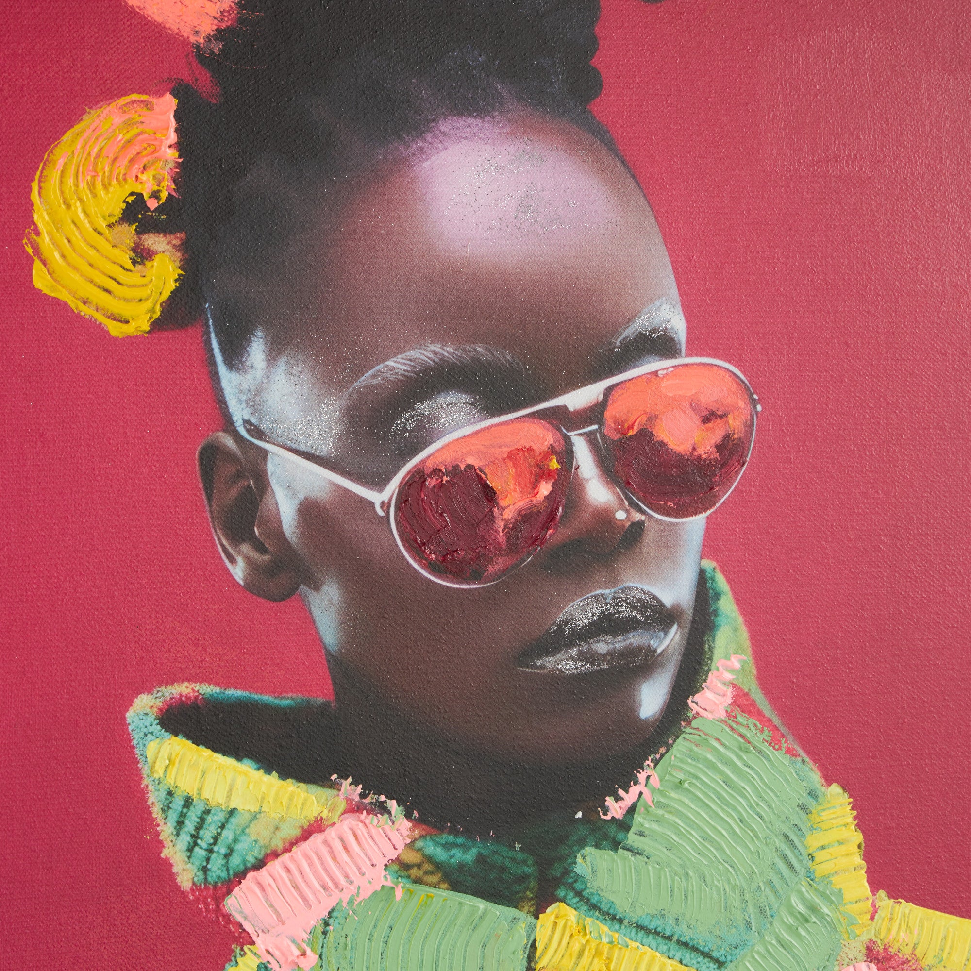 •The textured wall framed art has a square shape with a woman featuring an abstract color pattern and strokes, adding symmetry and style to your décor