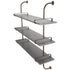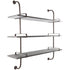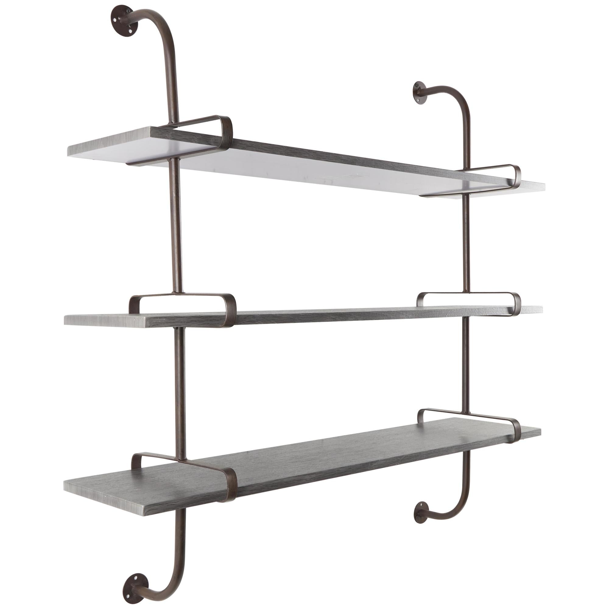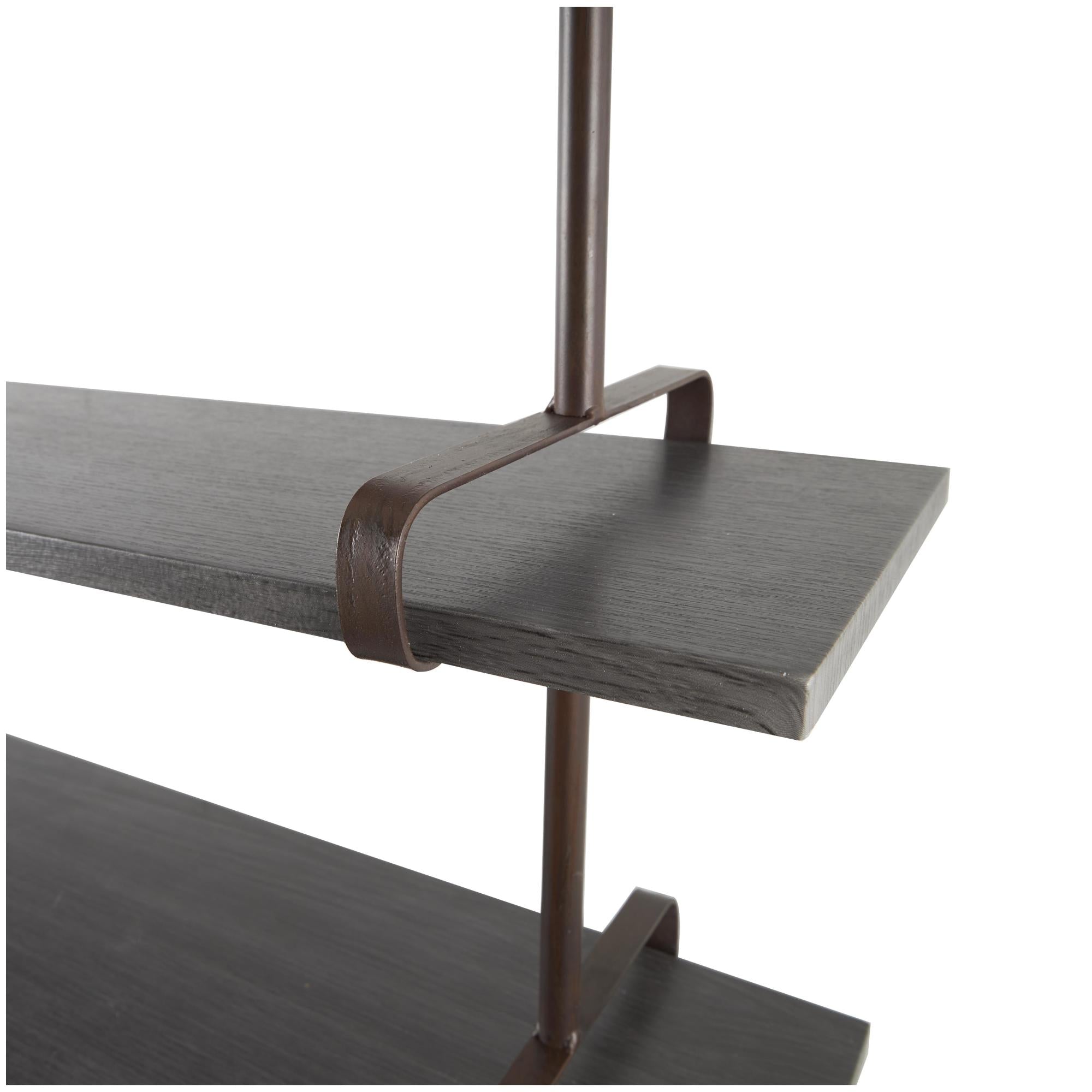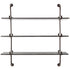 •Oiled room floating shelf showcases three rectangular shelving units and two side metal bars with decorative top and bottom mounting features
