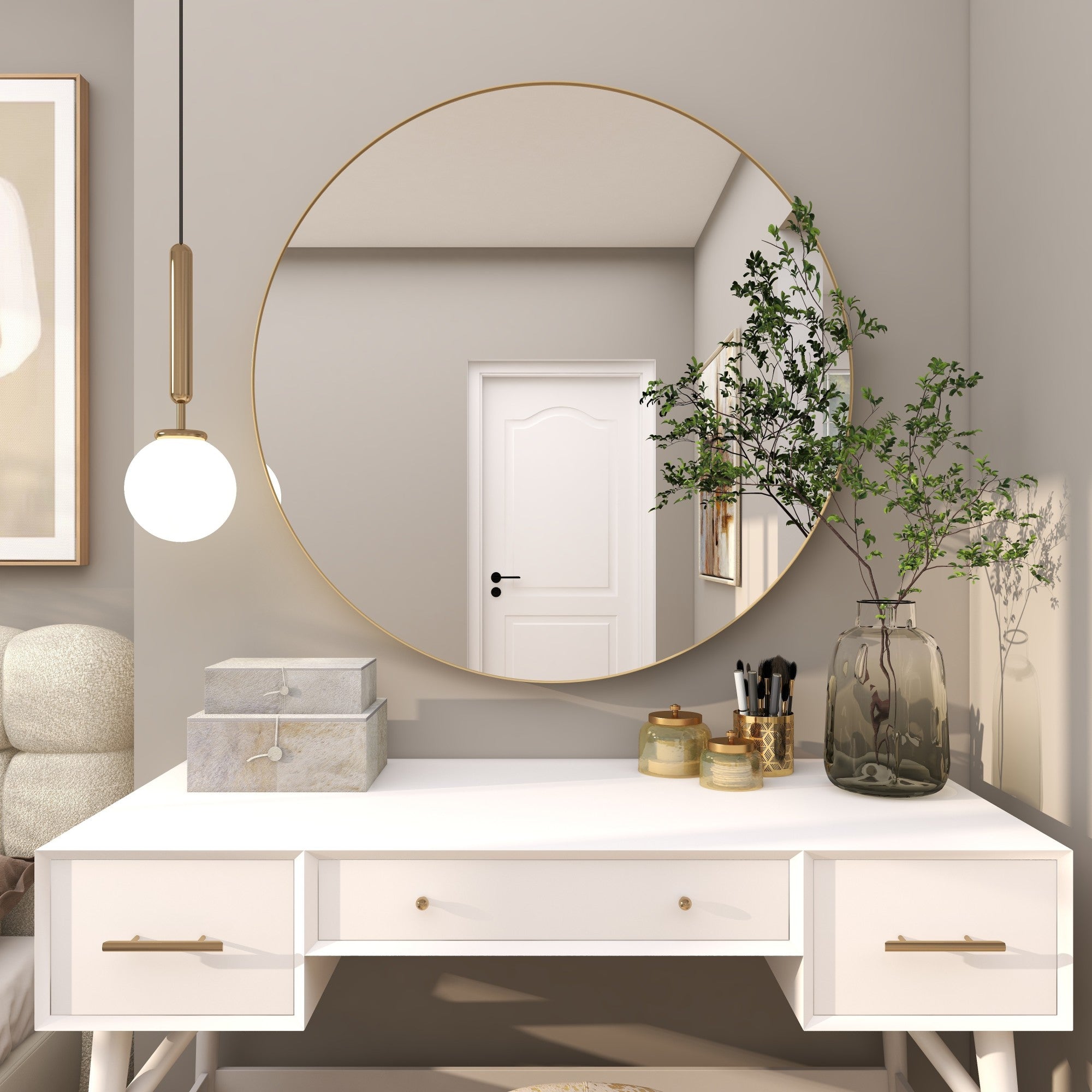•Sleek round shape complements the reflective finish of this wood wall mirror for a structured overall design that adds depth to the walls